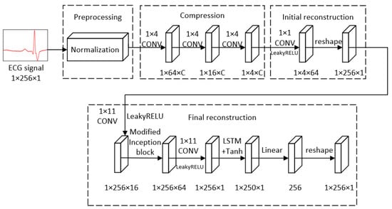 In this paper, we propose a deep compressive sensing framework for ECG signals. The model is mainly comprised of four modules: preprocessing; compression; initial reconstruction and final reconstruction. Before they are fed into the model, the original signals should be normalized in the preprocessing module. In the compression module, we can obtain the measurements of the ECG signals through the sequential convolutional layers. In the initial reconstruction module, we raised the dimension of the measurements to the same as the original signals, in order to make the data convenient to deal with in the following process. In the final reconstruction module, we exploited modified Inception block and LSTM to extract the features of the signals in order to further reconstruct the ECG signals with more accuracy. The overall framework is depicted in Figure 2. All of the details above will be described in the following subsections.