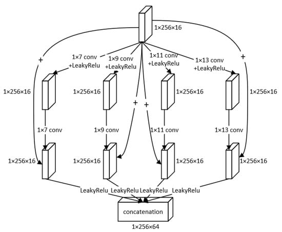 Inspired by GoogLeNet [], we adopted the modified Inception block to extract multi-level features from the signals. In the modified Inception block, we used different parallel convolutional layers with kernel sizes of 1 × 7, 1 × 9, 1 × 11, 1 × 13, respectively, in order to obtain information from the different receptive fields.