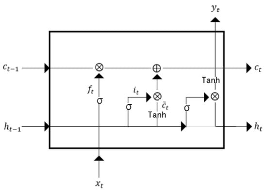 The structure of the LSTM cell is shown in Figure 4. The LSTM is comprised of an input gate, output gate, forget gate and cell state. The forget gate decides what features to use from to calculate the value of . The input gate is calculated through sigmoid activation function with input data and output of hidden node . The update value of the cell state is determined through a neural network layer, followed by a tanh activation function with and . Besides, is used to select the features from to update the value of . The output gate can be obtained by the similar calculation as the input gate. is obtained through the calculation of and . The formulations are listed as follows: