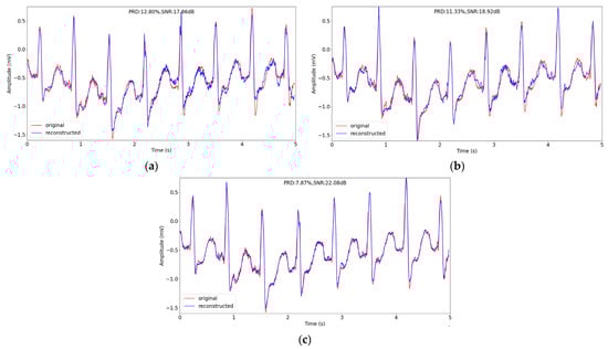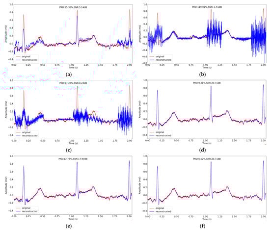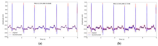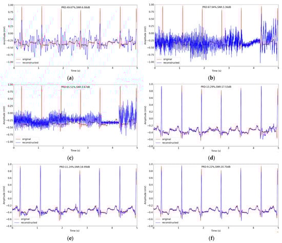 PRD describes the error of the reconstruction, and it can be related to the quality of the recovered signals []. The smaller the PRD, the better the performance of the reconstruction. The relationship is shown in Table 1. SNR is related to the ratio of the original signal and the noise. The bigger the SNR, the better the reconstruction.