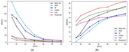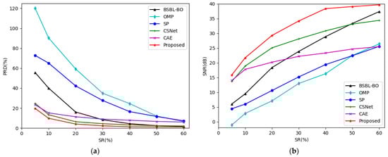 (a) The trend of PRDs using different CS methods at different sensing rates in MIT-BIH Arrhythmia Database; (b) The trend of SNRs using different CS methods at different sensing rates in MIT-BIH Arrhythmia Database.