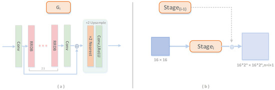 The training process uses multiple iterations, and each increases the resolution. In the first stage, G0 fits the input conditions and improves the image resolution at a low scale; the following stages restore the image details, such as low-frequency information that cannot be accurately reconstructed in the previous stage. Therefore, we propose to add the original features’ RRDB residual connection [32] to the output of the newly added convolutional layer and repeat this process N times until ×16 resolution is achieved. Under the default settings, we propose to train the last three levels of the generator asynchronously.
