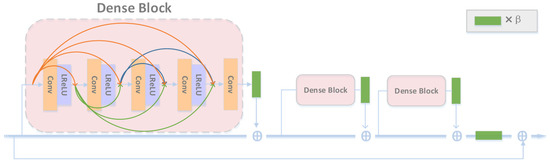 Different from ESRGAN [25], our generator network employed a multiscale pyramid structure. Note that ESRGAN removed the batch normalization (BN) layer from SRGAN [24] because BN layers tend to introduce unpleasant artifacts and limit the generalization ability. ESRGAN also replaced the original remaining blocks with RRDBs to improve the performance (Figure 2) because a deeper and more complex network could boost the performance [24]. As shown in Figure 2, we doubled the number of RRDBs and used the residual module to connect the different layer levels.