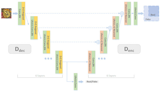 Qualitative methods can be helpful for identifying and characterizing features. Our scheme employed the discriminator’s encoder and decoder. We added a decoder to the ordinary encoder, and this architecture could provide pixel-by-pixel feedback to the generator while maintaining the global contextual information. The features compressed by the discriminator could decide whether or not the input image is real, as shown in Figure 4.