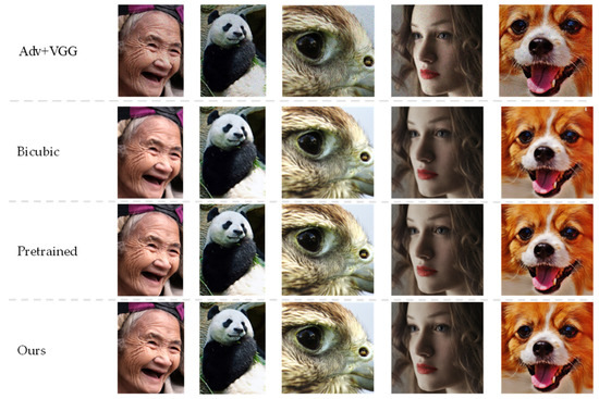 In Figure 5′s pre-trained volume, it can be observed that it is slightly less effective in generating images with more detail. For example, in the parts of the teeth and wrinkles on the image of the old man, the parts of eyes and pupils of the person on the image of the eagle and the woman, and the eyebrows and nose of the person in the fifth group of data, the image recovery of these facial features is not good enough. The proposed model is more advantageous on the validation set, and especially excellent on hair in images of dogs and wrinkles in images of elderly people. The above is a comparison experiment of the validation set, which can clearly show the advantages and disadvantages of each algorithm.