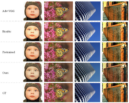 We take a closer look at the features of the baby’s face, the mottled part of the butterfly, the textured part of the building, and the tiled part of the wall in Figure 6. The results of the bicubic algorithm are not clear enough, and the dark parts of the image are rather obvious. Compared with the original image, the edge details shown in the pre-trained model are slightly blurred. The proposed algorithm can generate more iterative details in the image with clear and complete edges than the above algorithm. Figure 7 provides a comparison of the image details under different algorithms. It can be visually seen that our method is clear on the wrinkles of the human face and the straight lines and textures on the rectified buildings. Although there is a slight deviation from the original image, the image portrays a better sense of reality when viewed visually.