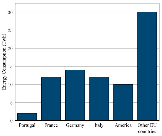 As one of the three major energy transmission systems in the industrial field, pneumatic systems account for a large proportion of industrial energy consumption, and their overall energy efficiency is low [4], which is 20–30% lower than that of electric transmission systems and hydraulic transmission systems. Pneumatic systems waste a lot of energy resources and have great energy-saving potential. At the same time, pneumatic systems are widely used in industry, including food processing, textiles, clothing, paper making, petrochemicals, mechanical mining, wind energy generation, transportation, and buildings [5,6,7,8,9,10]. With the rapid development of industry, the demand for compressed air is increasing year by year. In Australia and the European Union, the energy consumption of the pneumatic system accounts for 10% of the total industrial energy consumption [11]. Figure 1 shows the compressed air energy usage of 15 EU countries [12].
