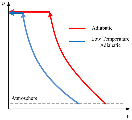 As shown in Figure 2, the temperature difference during compression will cause a change in energy consumption. Within a certain range, the lower the temperature during compression is, the higher the compression efficiency. The energy conservation technology of the pre-cooling air compressor system proposed in this paper makes the suction temperature Tin lower than the normal temperature and then compresses the air on the premise of avoiding condensation in the compression process. The air temperature increases gradually with the compression process and is higher than the normal temperature at a certain time node. Throughout the whole compression process, to a certain extent, it reduces the heat loss of air compression and improves compression efficiency.