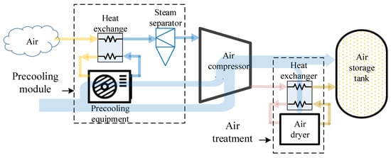 The pre-cooling air compressor system is proposed to reduce the Tin of the air compressor by adding a precooling module. The water content in low-temperature air is removed by a mechanical steam-water separator. This precooling method is expected to improve the overall efficiency of the air compressor. The system composition is shown in Figure 4.