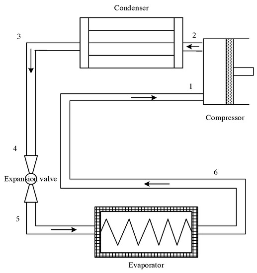 The pre-cooling air compressor system proposed in this paper increases the energy consumption of the precooling module based on a traditional air compressor system. The precooling module adopts the common vapor compression refrigeration cycle (VRC), as shown in Figure 5, to establish the model and make the following assumptions: