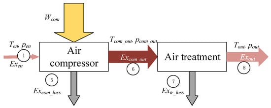 The exergy of air in both the traditional air compressor system and the pre-cooling air compressor system is calculated. In the case of the traditional air compressor system, air under environmental conditions enters the air compressor, discharges from the compressor at high pressure and high temperatures, flows in an air treatment component, and discharges at high pressure, atmosphere temperature. The exergy flow is shown in Figure 6.