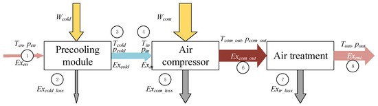 In the case of precooling air compressor system, as shown in Figure 7, air flows through a precooling module and then into the air compressor. The energy consumption of the precooling module Wcold results in an increase in the exergy in the air. Irreversible of the precooling module results in the exergy loss Excold_loss in the air. The exergy of the air in the entrance Exen and outlet Excold of the precooling module is written as.
