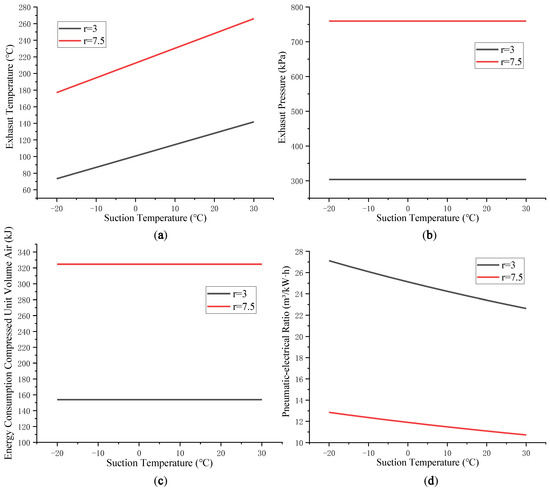 It can be seen intuitively from Figure 8 that with the increase in Tin, the exhaust temperature of the air compressor system will increase, while the exhaust pressure and the overall energy consumption of the system remain unchanged, and the pneumatic-electrical ratio δ shows a downward trend. The reason for this is that when Tin is increased, the air density decreases. When the unit volume of air is compressed, the mass of high-pressure air is reduced, resulting in the reduction of δ for the system. When the pressure ratio is low, compressing the gas per unit volume consumes more energy, resulting in the overall pneumatic-electrical ratio of the system being higher than that of the high-pressure ratio. For the air compressor system, reducing Tin can improve the pneumatic-electrical ratio of the system to a certain extent and achieve the optimization effect of energy conservation and emission reduction.