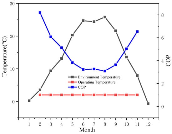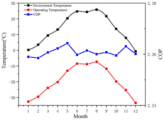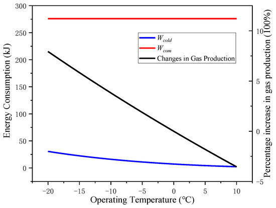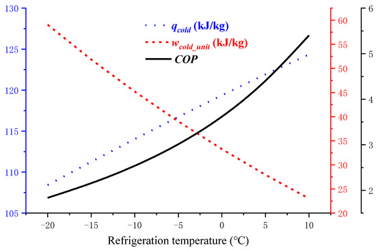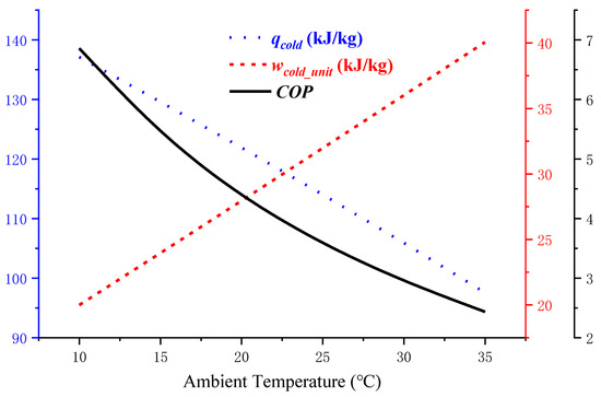 In Figure 9, the blue dotted line represents the refrigerating capacity that can be transmitted by the unit refrigerant system during the cooling process from Ten to Tcold, while the red dotted line represents the energy consumed by the VRC system; the black curve shows the variation trend of COP with Ten under the same Tcold. It can be clearly seen that when Tcold is constant, the COP of the VRC system decreases with increasing Ten. This is because the higher Ten is, the higher the corresponding condensation temperature Tc and condensation pressure. Therefore, the energy consumption wcold_unit consumed by the refrigeration compressor is greater in the VRC system. The higher Tc is, the lower the enthalpy of the saturated liquid refrigerant. Therefore, the cooling capacity qcold is lower. According to Equation (5), the system COP is reduced.