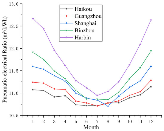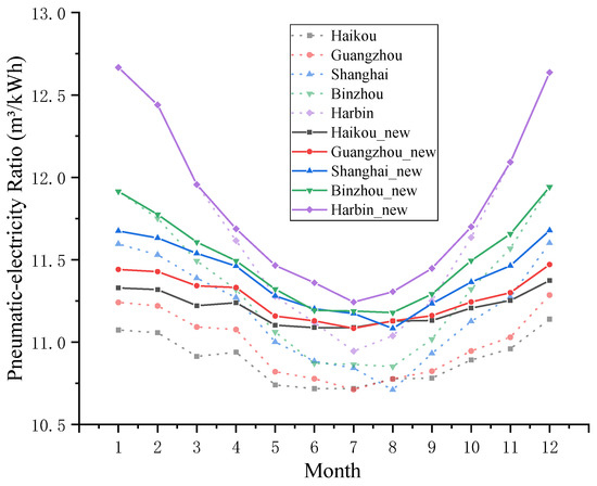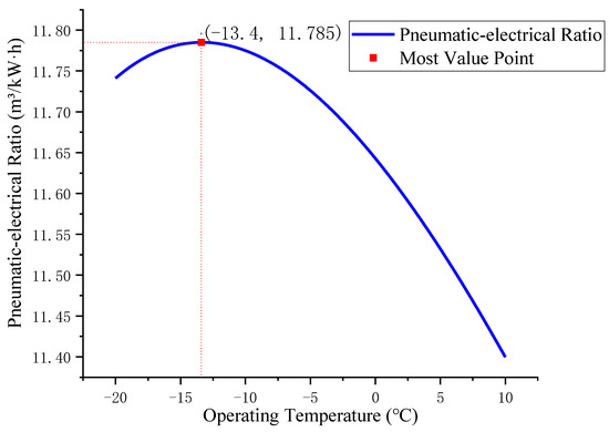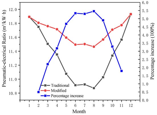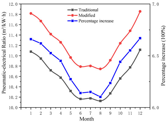 As for the economy of the precooling air compressor system, tests have been carried out in Binzhou, Shandong Province, China. The rated power of the operating air compressor is 800 kW, and the rated gas production is 9600 m3/h. The life cycle of the system is 15 years. The inlet temperature changes periodically with the current weather and temperature. The optimal operating temperature is calculated according to the monthly average temperature (about −1.04~26.25 °C) and monthly average relative humidity (about 45%~70%), and then the COP (about 2.25~4.24) under the corresponding working conditions. The average monthly pneumatic-electrical ratio increase is about 4.69%. The economy of the system is analyzed by the method of the whole life cycle cost of the system. On the basis of the technical feasibility of this paper, combined with the actual situation of the application scenario, according to the environmental conditions, timely adjust the working condition of the pre-cooling module, so as to keep the system in the optimal working condition, the system unit cubic gas production cost can be better optimized. Partial results are shown in the table below. Further detailed discussion on system economy is required.