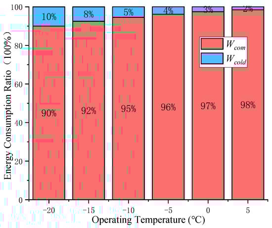 When the humidity is too high, the cooling capacity consumed by water vapor will increase the energy consumption of the precooling equipment to a certain extent. When Ten = 20 °C, Pen = 101.3 kPa, Tcold = 5 °C, the air relative humidity changes from 30% to 65%, proportion of air and water vapor cooling energy consumption is shown in Figure A1. Subsequent analysis should be carried out in combination with regional temperature and humidity in order to provide a better reference for practical engineering.