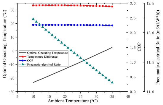 Generally, in the actual refrigeration demand, the VRC system reduces the higher ambient temperature Ten to the required refrigeration temperature of Tcold. In the model simulation, the common refrigerant R404A is selected, the variation range of Ten is 10 °C to 35 °C, and the required Tcold is 5 °C. According to the empirical parameters, the undercooling degree in the VRC is set to 5 °C, and the superheating degree is set to 8 °C. Under these conditions, the system operating curve for the VRC model is shown in Figure 9.