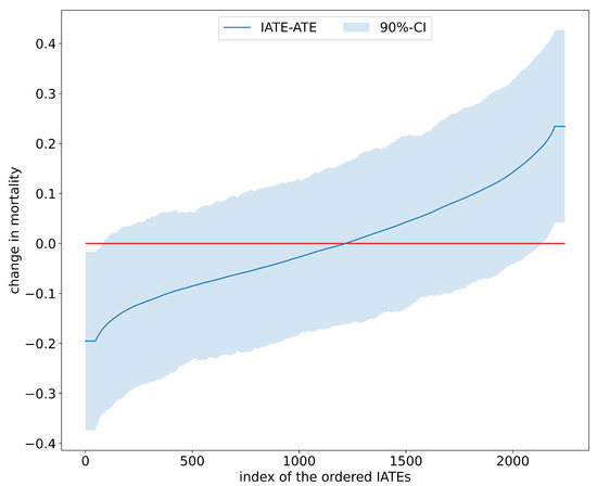 Table 2 juxtaposes results on the estimated average effects of RHC on mortality after six months from [22] and the mcf. Findings for the ATE and ATET are congruent in terms of effect size and statistical significance and confirm that, on average, the RHC intervention decreases survival chances. Interestingly, as displayed in Figure 3, the distribution of the IATEs shows that there is a non-negligible mass left to zero. Abstracting from estimation uncertainty, some parts of the populations are estimated to benefit from the RHC intervention. An analysis of the difference of IATEs against the ATE confirms that subpopulations, which have IATEs at the tails of the distribution in Figure 4, have treatment effects that are statistically different from the ATE.