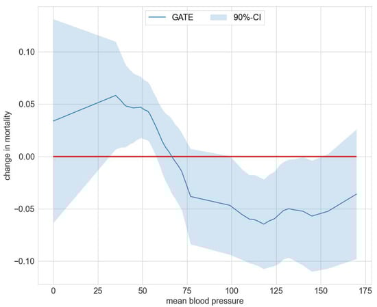 Exemplarily, Figure 5 summarizes the deviation of GATEs from the ATE for the policy feature blood pressure. The corresponding data for Figure 5 are included in Table S7 in the Supplementary Materials file. Figure 5 shows a significantly higher death risk for patients with extremely low diastolic blood pressure from 35 to 57 and lower death risk for a blood pressure from 106 to 145. Note that a diastolic blood pressure of zero may occur in cases of severe hypotension, stiff arteries in the elderly, diabetes, arteriovenous malformation, aortic dissection, or due to monitoring malfunction [26]. In the Supplementary Materials file we provide further results on effect heterogeneity in Tables S8 and S9. Patients with APACHE III scores ranging from 21 to 45 experience, on average, a significant increase in survival. Those with scores ranging from 55 to 66 have a significantly lower survival probability. For the policy feature summarizing the patient’s primary disease, Table S9 displays a significantly higher death risk than the average for patients with non-traumatic coma.