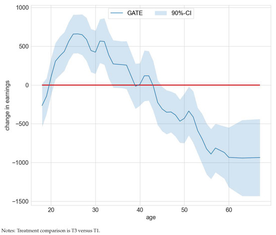 Our group heterogeneity analysis focused on two policy features—claim to unemployment compensation and age. The authors of [30] showed that unemployment compensation status is an important confounding feature and hence may give rise to effect heterogeneity. Indeed, the GATE deviates statistically significantly from the ATE for the policy feature unemployment compensation. The deviations are negative for subjects with a claim to unemployment for T3 versus T1, T3 versus T2, and positive for T4 versus T3. Contrariwise, the deviations are positive for subjects without a claim to unemployment for T3 versus T1, T3 versus T2, and negative for T4 versus T2. The results also hint at meaningful effect heterogeneity for the policy feature age as measured by a significant deviation of the GATE from the ATE. For example, when comparing treatment groups T3 versus T1, the GATE deviates positively from the ATE for ages 21 to 33 and negatively for ages 45 to 67 (compare Figure 7). This hints at an optimal assignment rule that should target clients of different ages and unemployment compensation statuses differently when resource or capacity constraints are binding. Detailed results on the GATEs and GATEs minus the ATEs for both policy features age and claim to unemployment compensation are included in Tables S10–S13 in the Supplementary Materials file.
