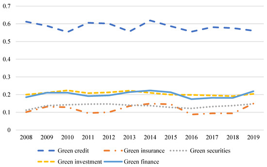 Based on this, this paper uses the entropy method to construct the index system of green credit, green investment, green insurance, green securities, and green finance. Figure 2 shows the changes in green credit, green securities, green insurance, green investment, and green financial indicators from 2008 to 2019. From 2008 to 2019, except for a slight decline in the green credit index, the green credit indicators showed a fluctuating growth trend. The figure shows that although green credit has declined slightly, green finance, green insurance, green securities, and green investment have shown a fluctuating growth trend. China’s emphasis on green finance is gradually increasing.