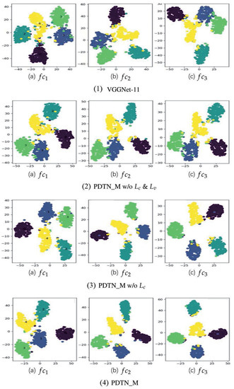The key to copying with cross-corpus SER is to extract the discriminative speech emotion feature. Therefore, to demonstrate the superiority of the proposed method on emotion discriminative preservation, we choose the features under the task of for the visualization. The feature distributions of different emotions are visualized in Figure 3, in which the features are generated by the fc layers (i.e., , , and ) in the PDTN based on VGGNet-11. The distributions are shown through t-SNE [36], and the points of different colors represent the corresponding emotions, i.e., anger, disgust, fear, happiness, and sadness.