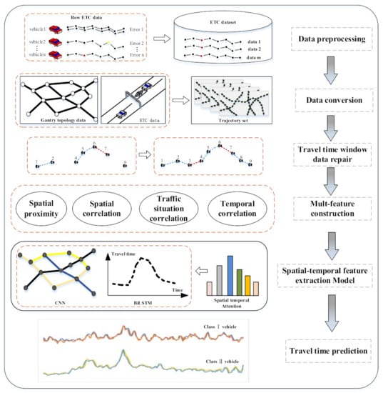 In this section, we give an overview of the proposed model as shown in Figure 1. First, we preprocess the data to remove abnormal data and ensure the integrity of the data. On this basis, we converted the ETC data into vehicle trajectories based on the gantry topology data, so that we could obtain the travel time of vehicles in all sections. However, there is no traffic flow in a certain period of time in some sections, so there is no travel time in a certain time interval. Therefore, we supplemented the missing data by repairing the algorithm. After preparing the data, we analyzed and modeled multiple features, and process the vehicle separately according to the vehicle type. Finally, we used CNN to capture spatial correlation and BiLSTM to capture temporal correlation and then used the attention mechanism of spatial and temporal information to capture important information for model prediction. Therefore, we could obtain the predicted travel time of each vehicle.