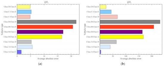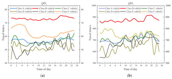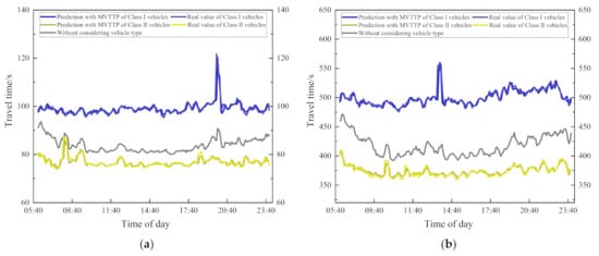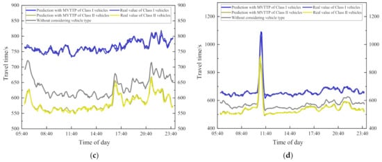 Figure 13 is the travel time visualization of four sections, which shows that there is a big difference between the predicted travel time without considering and the real travel time of the vehicle in most of the time. For the section with a travel time of about 100 s, the prediction error is about 10 s, while for the section with a longer travel time, the error is about 100 s, and the error is about 10%. The predicted travel time without considering the type of vehicle is much higher than the predicted travel time of Class II vehicles. This is because Class II vehicles will be faster than other types of vehicles, and travel time will be shorter. Only in the peak period of travel is the speed of the vehicle reduced, and the travel time of all vehicles is similar. The difference between the predicted value without considering the type of vehicle and the real travel time of the Class II vehicles will be reduced. For the travel time prediction of Class I vehicles, the travel time is far less than the predicted value without considering the type of vehicle. Compared with Class II vehicles, the real travel times of Class I vehicles have a bigger difference from the predicted value without considering the vehicle type. The error of all sections is greater than 10% most of the time, and only in the peak period will the gap narrow.