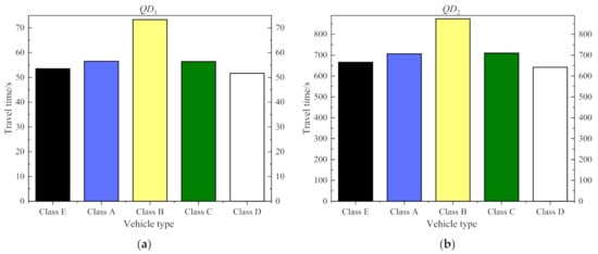 - The predicted travel time without considering vehicle type is higher than the real travel time of small vehicles and smaller than the real travel time of big vehicles. The error of travel time prediction without considering the type of vehicle is about 10%. After considering the type of vehicle, the prediction performance of the model has been significantly improved, and the predicted values of the model are close to the real travel time values of the vehicle.