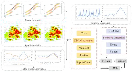Travel time prediction is an important part of an intelligent expressway, which provides travelers with travel time information of each path, helps travelers make more intelligent travel decisions, and formulates more accurate and reasonable expressway driving schedules []. In addition, travel time prediction can also provide auxiliary decision-making information for road management and rectification for traffic management departments. A large number of researchers have studied travel time prediction [,,], with the deepening of research, the error value is gradually reduced, but there are still some problems. First, there is no separate discussion of different types of vehicles, and different types of vehicles on expressways have different travel characteristics []. Most researchers predict the future travel time based on the overall travel time of all vehicles, which may seriously affect the accurate prediction of travel time and cannot be applied to fine expressway management. Second, the road proximity is not considered, which has great influence on traffic prediction []. However, the proximity of the road network is not considered in the current travel time prediction research. Third, the important information extraction does not consider both spatial and temporal features. In the long-term sequence processing, different information of time dimension and space dimension has different weights for the prediction model [,]. If more weight can be given to the important information of the two dimensions of time and space, the accuracy of the prediction model could be further improved.