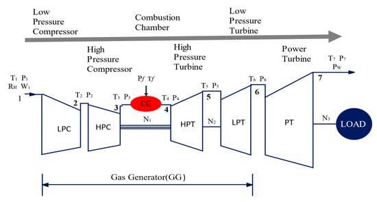 where h3 is the high-pressure compressor exit enthalpy, h4 is the combustion chamber exit enthalpy, is the inlet air mass flow rate, is the fuel mass flow rate, LHV is the lower heating value, and is the combustion efficiency. Here, is the high-pressure compressor’s work rate, is the high-pressure turbine’s work rate, is the low-pressure compressor’s work rate, is the high-pressure turbine’s work rate, is the power turbines work rate, and is the load.