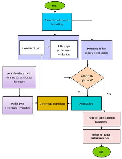 A gas turbine performance model needs two components—a design point model and an off-design model []. The design point model is a simulation of the engine at full load, calculating all parameters at each station of components. It is a single operating point and is considered one operating point in an off-design performance simulation. The design point performance of the actual gas turbine cycle is determined by combining the performance of distinct components [,]. A cost-effective solution to this challenge is to reduce the experimental data to a minimum and acquire the remaining values using gas turbine performance modelling []. The accessible data in this inquiry is confined to a few critical design point performance data points and a small amount of gathered data. As a result, the technique depicted in Figure 2 is recommended for evaluating the component load performance. These certain design point data were collected from the manufacturer’s technical manuals or catalogues. To complete the collection of the design point performance data, an energy-based design point assessment approach was applied []. The model is confirmed if the generated results are close to those obtained directly from the gas turbine engine []. Otherwise, the parameters that govern the geometry of the component maps can be optimized using an optimization technique.