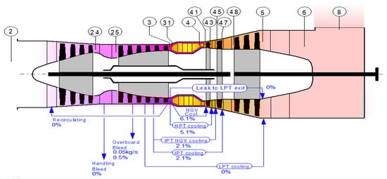 The values for the overboard bleed air, HPT NGV 1 cooling, HPT rotor 1 cooling, IPT NGV 1 cooling, and IPT rotor 1 cooling were about 0.5%, 5%, 3%, 1%, and 1%, respectively. The secondary air fractions were estimated by considering other three-shaft engine design point performance models.