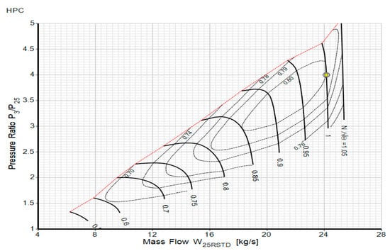 The next stage was to create an off-design model using GasTurb 13 after the cycle design point calculations had been successfully approximated. The off-design performance refers to the ability of gas turbines to operate for long durations under situations other than their design settings. A change in engine load and ambient conditions might cause an off-design state. The ambient temperature, for example, may vary substantially from winter to summer, affecting the engine performance significantly. As a result, the engine must not only function well under the design settings, but it must also work well under off-design situations. Off-design simulations have two key tasks: the first task is the adaptation of the target engine’s design point with the already known compressor and turbine maps using the scaling approach; for instance, Figure 5 shows the scaling of the high-pressure compressor point to the design point. In this case, the map is scaled for the design operating point at an auxiliary beta value of 0.5 when the pressure ratio, isentropic efficiency corrected flow, and corrected speed are 4, 0.8, 24.146, and 1, respectively. All five component maps are scaled to the design point in the same fashion. The second off-design task is component matching by ensuring the mass flow and work compatibility using the Newton–Raphson iterative process [,]. For compressor and turbine map modifications, an appropriate characteristics map containing the design point data should be chosen. As recommended by Kurzke [], an auxiliary coordinate will be introduced into the component map digitization procedure to eliminate disagreement. The relationship between the corrected rotational speed, corrected mass flow rate, pressure ratio, and isentropic efficiency will be shown in the component maps. The rotating speed (rpm), intake mass flow rate (kg/s), inlet temperature (K), and inlet pressure to the compressor or turbine (kPa) are represented as the main parameters in the compressor and turbine maps. To make utilizing the performance maps easier, it is normal to use the design point values to standardize the corrected speed, corrected mass flow, pressure ratio, and isentropic efficiency.