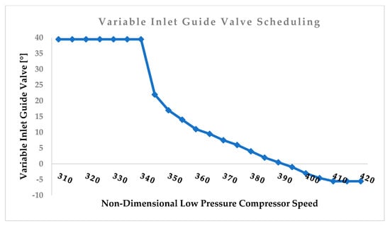 Right after the scaling of the map to the design point, the off-design model was developed and validated with the manufacturer data. GasTurb 13, a commercial software, was used to evaluate the off-design model. The power output versus ambient temperature and efficiency versus ambient temperature from the catalogue data were used to validate the off-design model. In this research, the VIGV scheduling and bleed air were considered. The VIGV scheduling graph shown in Figure 6 was incorporated into the software during the simulation of the engine. The VIVGV scheduling data were collected from the engine manufacturer’s data. Likewise, by incorporating the VIGV scheduling data, the power output versus ambient temperature data from the engine manufacturer were also incorporated into the simulation software. This is a way of controlling the model with the power output. For the power output, it is always desired that it remains unchanged because the specific amount of power always needs to be constant throughout the operation. Even if there is a fault in the engine that deteriorates the performance, to maintain the power output the heat will be increased.