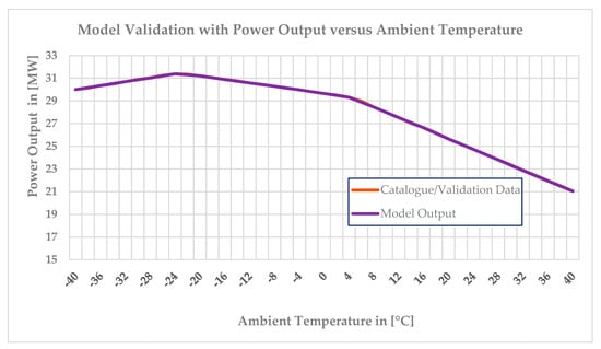 After scheduling or incorporating the above three graphs shown in Figure 5 into the software, the off-design model was used to generate data and then the generated data were compared with the validation data. Finally, the models that yielded the power output versus ambient temperature and efficiency versus ambient temperature were accurately matched with the validation data. The maximum deviation in the power output versus ambient temperature at each operating point was 0.02%, whereas a 4.5% deviation was noted in the efficiency versus ambient temperature. Comparisons between the model outputs and validation data are depicted in Figure 7 and Figure 8 below. The model output with the power output versus ambient temperature catalogue data is depicted in Figure 7 and the output with the thermal efficiency versus ambient temperature catalogue data is depicted in Figure 8 below.