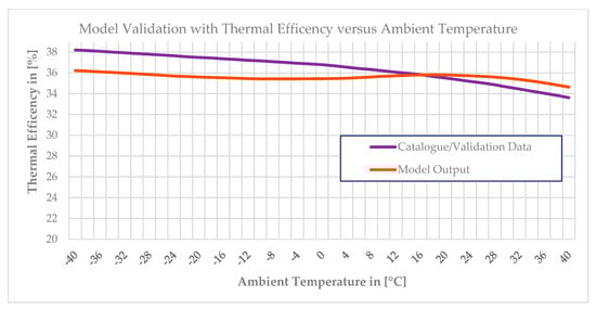Validation of the off−design model with the thermal efficiency versus ambient temperature.