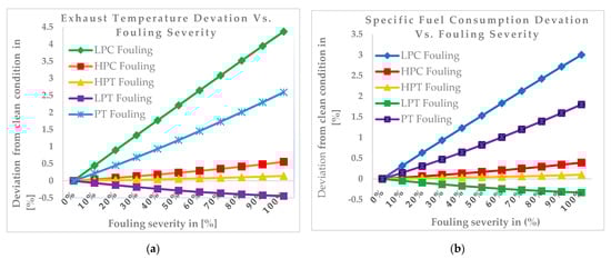 where . and . describe the scaling factors used to scale the compressor flow capacity and efficiency, respectively; . describe the scaling factors used to scale the turbine compressor flow capacity and efficiency, respectively; . and . represent the variation amounts of turbine health parameters, while and are the variation quantities of compressor health parameters. After implanting physical faults using the relations, the effects of the fouling and erosion severity on the exhaust temperature, specific fuel consumption, thermal efficiency, overall pressure ratio, and turbine inlet temperature were simulated. The severity of fouling was assessed for each of the five components.