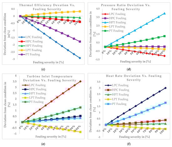 All of the numbers above clearly indicate the effects of the fouling on the gas turbine output parameters. The effect of the fouling on the exhaust temperature is depicted in Figure 9a. The maximum increase in the exhaust temperature due to fouling occurs in the low-pressure turbine, by about 4.3%, whereas it drops when the fouling occurs in the low-pressure turbine, by about −0.5%. Figure 9b depicts the effect of fouling on the specific fuel consumption rate. The deviation trend is similar to the graph of the exhaust temperature deviation due to fouling. The maximum drop in the specific fuel consumption rate due to fouling occurs in the low-pressure turbine, by about −0.5%, whereas the maximum rise occurs when the fouling occurs in the low-pressure compressor, by about 3%. Figure 9c shows the influence of the fouling on the thermal efficiency, and the result shows that the fouling decreases the thermal efficiency when it occurs in each component except the low-pressure turbine. The maximum efficiency drop occurs when fouling is implanted in the low-pressure compressor, by about −3%, where the maximum rise can be observed for the low-pressure turbine, by about 0.3%. Figure 9d depicts the effects of fouling on the overall pressure ratio. The overall pressure ratio decreases substantially when the fouling occurs in the low-pressure compressor, by about −1% at the 100% fouling severity level, whereas it rises when the fouling occurs in the high-pressure turbine, by about 4% at the 100% fouling severity level. Figure 9e depicts the effect of the fouling on the turbine inlet temperature. The deviation trend is similar to the graphs of the exhaust temperature and specific fuel consumption deviation. The maximum drop in the turbine inlet temperature due to the fouling occurs in the low-pressure turbine, by about −0.8% at the 100% fouling severity level, whereas the maximum rise occurs when the fouling occurs in the low-pressure compressor, by about 3.7% at the 100% fouling severity level. Figure 9f depicts the effect of the fouling on the heat rate. The deviation trend is similar to the graphs of the exhaust temperature, specific fuel consumption, and turbine inlet temperature deviation. The maximum drop in the heat rate due to the fouling occurs in the low-pressure turbine, by about −0.4%% at the 100% fouling severity level, whereas the maximum rise occurs when the fouling occurs in the low-pressure compressor, by about 3.1% at the 100% fouling severity level.