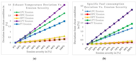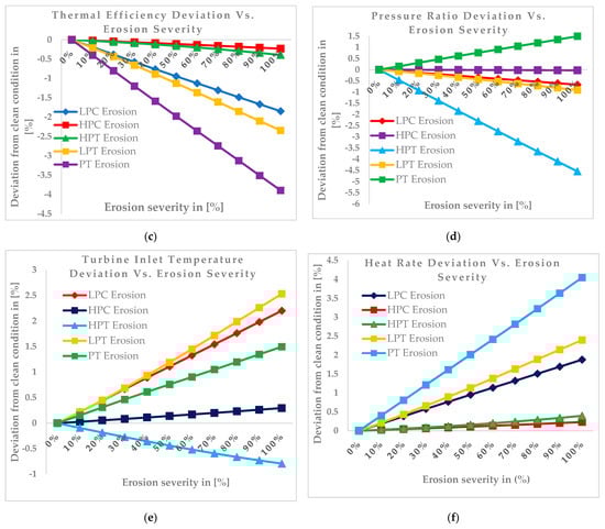 Figure 10a illustrates the effects of erosion on the exhaust temperature. As the figure shows, the maximum rise in exhaust temperature occurs when the erosion is implanted into the low-pressure turbine, by about 3.5% at the 100% erosion severity level. The minimum deviation in exhaust temperature is shown when erosion occurs in the high-pressure compressor, by about 0.3% at the 100% erosion severity level. It can be observed that the exhaust temperature rises when erosion occurs in all of the main components. The effects of the erosion on the specific fuel consumption are depicted in Figure 10b. The figure illustrates that the specific fuel consumption rises when the erosion occurs for all five components. The maximum rise in the specific fuel consumption can be observed when the erosion occurs in the power turbine, by about 4.1% at the 100% erosion severity level, whereas the minimum specific fuel consumption rise is shown when the erosion occurs in the high-pressure compressor, by about 0.2% at the 100% erosion severity level. Figure 10c illustrates the influence of the erosion on the thermal efficiency. From the results, it can be observed that a thermal efficiency decrement occurs for each component when erosion occurs. The maximum efficiency drop occurs when the erosion is implanted into the power turbine, by about −4% at the 100% erosion severity level, whereas the minimum drop can be observed for the high-pressure compressor, by about −0.2% at the 100% erosion severity level. Figure 10d depicts the effects of erosion on the overall pressure ratio. The maximum overall pressure ratio drop can be observed when the erosion occurs in the high-pressure turbine, by about −4.5% at the 100% erosion severity level, whereas it rises when the erosion develops in the pressure turbine, by about 1.5% at the 100% erosion severity level. Figure 10e depicts the effects of the erosion on the turbine inlet temperature. When the erosion occurs in the low-pressure turbine, the turbine inlet temperature increase will be higher than in other the components, but it will drop in the high-pressure turbine. The result clearly shows that the maximum turbine inlet temperature rise occurs when erosion occurs in the low-pressure turbine, by about 2.7% at the 100% erosion severity level, whereas the maximum drop can be observed when erosion occurs in the high-pressure turbine, by about −0.7% at the 100% erosion severity level. Figure 10f shows the effect of the erosion on the heat rate. As the figure shows, the maximum rise in the heat rate occurs when the erosion is implanted into the pressure turbine, by about 4% at the 100% erosion severity level. The minimum rise in the heat rate is shown when the erosion is implanted into the high-pressure compressor, by about 0.2% at the 100% erosion severity level. After assessing the effects of the fouling and erosion on the output parameters of the gas turbine engine, the effects of the fouling and erosion on component efficiency were simulated. The aim of the simulation was to predict the effects of fouling and erosion in one component on another clean component. The simulation results are depicted in the following graphs.