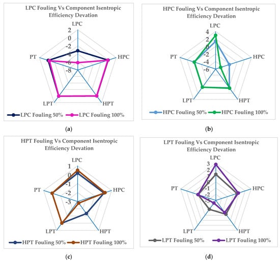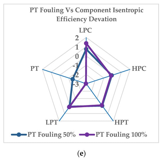Figure 11a illustrates the variation in the component isentropic efficiency rates when fouling occurs in the low-pressure compressor at the fouling fault severity levels of 50% and 100%. In this simulation the maximum decreases in isentropic efficiency occur on the compressor itself, by about −3.23% at the 50% and −6.18% at the 100% severity level. The maximum effects on the deviation of the other component’s isentropic efficiency can be observed for the low-pressure isentropic efficiency at the 50% and in the power turbine at the 100% severity level, by about 0.4% and −0.6%, respectively. Figure 11b illustrates the variation in the component isentropic efficiency rates when the fouling occurs in the high-pressure compressor at fouling fault severity rates of 50% and 100%. The maximum decreases in isentropic efficiency occur on the compressor itself, by about −2.18% at 50% and −4.61% at 100%. The maximum deviation in the other component’s isentropic efficiency can be observed in the low-pressure compressor, by about 1.39% at 50% and about 2.96% at 100%. The lowest effects can be observed in the low-pressure turbine, by about −0.0083% at 50% and about −0.022% at the 100% severity level. Figure 11c illustrates the variation in the component isentropic efficiency when fouling occurs in the high-pressure turbine at fouling fault severity levels of 50% and 100%. The maximum decreases in isentropic efficiency can be observed in the high-pressure turbine, by about −1.33% at 50% and about −2.78% at the 100% severity level. The maximum deviation of the other component’s isentropic efficiency was observed in the low-pressure compressor, by about 0.17% at 50% and about 0.5% at the 100% severity level. Figure 11d illustrates the variation in component isentropic efficiency rates when fouling occurs in the low-pressure turbine at fouling fault severity levels of 50% and 100%. The maximum decreases in isentropic efficiency occur in the low-pressure turbine, by about −1.21% at 50% and about −2.46% at the 100% severity level. The effect on the deviation of the other component’s isentropic efficiency is maximal in the low-pressure power compressor, by about 1.23% at 50% and about 2.84% at the 100% severity level. Figure 11e illustrates the variation in the component’s isentropic efficiency when fouling occurs in the pressure turbine at fouling fault severity levels of 50% and 100%. The maximum decreases in isentropic efficiency are shown in the power turbine, by about −1.45% at 50% and about −2.97% at the 100% severity level. The effect on the deviation of the other component’s isentropic efficiency is maximal in the low-pressure compressor, by about 0.73% at 50% and about 1.36% at the 100% severity level.