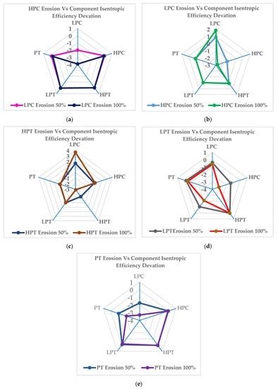 Figure 12a illustrates the variation in the component’s isentropic efficiency when the erosion occurs in the low-pressure compressor at the erosion fault severity levels of 50% and 100%. The maximum decreases in isentropic efficiency occur on the compressor itself, by about −2.0% at 50% and −3.09% at the 100% severity level. The maximum deviation in the other component’s isentropic efficiency due to low-pressure compressor erosion is shown maximum for the power turbine, by about −0.18% at 50% and −0.37% at the 100% severity level. Figure 12b depicts the variation in component isentropic efficiency rates when the erosion occurs in the high-pressure compressor at erosion fault severity levels of 50% and 100%. The maximum decreases in isentropic efficiency occur on the compressor itself, by about −1.35% at 50% and about −2.75% at the 100% severity level. The effect on the deviation of the other component’s isentropic efficiency is maximal in the low-pressure compressor, by about 0.9% at 50% and 1.80% at the 100% severity level. Figure 12c depicts the variation in component isentropic efficiency rates when the erosion occurs in the high-pressure turbine at erosion fault severity levels of 50% and 100%. The maximum decreases in isentropic efficiency are shown on the turbine itself, by about 1.67% at 50% and about 3.67% at the 100% severity level. The effect on the deviation of the other component’s isentropic efficiency is maximum in the low-pressure compressor at about −1.35% at 50% and −2.87% at the 100% severity level. Figure 12d illustrates the variation in component isentropic efficiency rates when the erosion occurs in the low-pressure turbine at erosion fault severity levels of 50% and 100%. The decreases in isentropic efficiency occur in the low-pressure compressor, by about −1.03% at 50% and about −2.07% at the 100% severity level. The effect on the deviation of the other component’s isentropic efficiency is maximal in the high-pressure compressor, by about -−1.36% at the 50% severity level and −3.6% at the 100% severity level. Figure 12e illustrates the variation in component isentropic efficiency rates when the fouling occurs in the pressure turbine at erosion fault severity levels of 50% and 100%. The variation in isentropic efficiency rates in the power turbine is about −1.09% at 50% and −2.18% at the 100% severity level. The effect on the deviation of the other component’s isentropic efficiency is maximal in the low-pressure compressor, by about −1.73% at 50% and −3.29% at the 100% severity level.