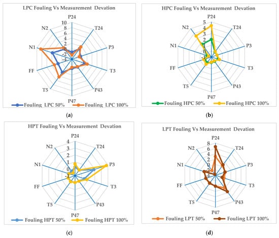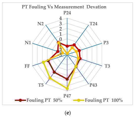 Deviations in the measurement parameters at fouling severity levels of 50% and 100% in the full−load condition for different offending components: (a) LPC; (b) HPC; (c) HPT; (d) LPT; (e) PT.