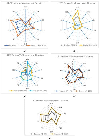 Deviations in the measurement parameters at erosion severity levels of 50% and 100% in the full−load condition for different offending components: (a) LPC; (b) HPC; (c) HPT; (d) LPT; (e) PT.