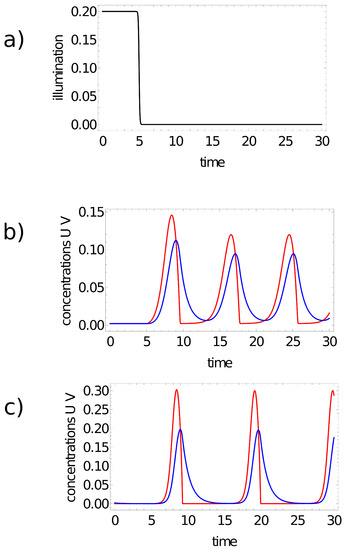 Such a definition of involves a few parameters: W and determine the limiting values of illumination at . The value of illumination time defines the moment of time when the most rapid changes in illumination occur, and represents the rate at which the transition occurs. The minus sign in the argument of the function implies the transition from steady state (high illumination) towards oscillations (low illumination). In the presented simulations, I used fixed values: , and . For such parameters, the value of is high (∼0.2) in the time interval () (cf. Figure 2a). Oregonator models with parameters given above predict stable steady state. For long times (), the value of approaches , which corresponds to oscillations.