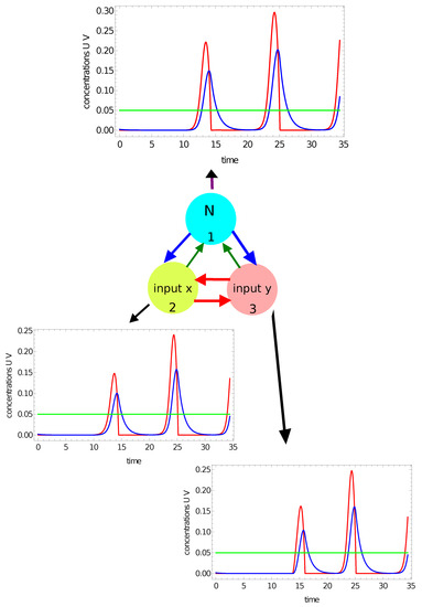 In previous papers on classification with networks of interacting chemical oscillators, the number of activator maxima observed within the time interval on a selected node (say #j ) was considered as the output [47,49]. However, there is a question: What is the maximum of activator? I assume that should have a maximum in a strict mathematical sense. This means that if has a maximum at , then there exists such that for all . Therefore, if is growing at the end of Z, then is not regarded as a maximum. Moreover, the value of should be larger than the activator concentration in the part of the oscillation cycle when the catalyst is in its reduced form. Here, I assume that the threshold value is . To illustrate maxima counting, let us consider the network with parameters given in the first row of Table 1. Figure 4 and Figure 5 show the time evolution of activator (red curves) and inhibitor (blue curves) at all nodes for two selected points of the flag. The green line marks the threshold for the activator maximum (). The results in Figure 4 illustrate the time evolution of activator and inhibitor on all nodes when the coordinates of the input point are: . The point characterized by such coordinates is located in the red area of the flag. For this input, there are two maxima of the activator at all network nodes. It can also be seen that on all nodes, the concentration of the activator is larger than at the final stage of the evolution. However, the function is still growing at the end of Z, so the third maximum of is not observed. Figure 5 illustrates the time evolution of activator and inhibition on all nodes if the coordinates of the input point are: . This point is located in the white region of the flag. Now, we observe three maxima of the activator at nodes #1 and #3, and two maxima at node #2. Therefore, if we consider the number of maxima on a selected oscillator as the network answer, then by selecting nodes #1 or #3, one can distinguish which of two points is white and which is red. Such classification is not possible if node #2 is considered the output. Selection of the output node can be made on the basis of correct answers for the records included in the training dataset.