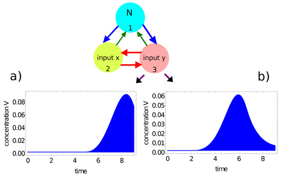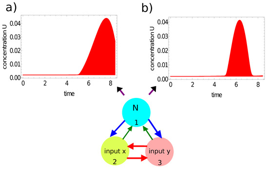 Figure 7 and Figure 8 illustrate another method for extracting the output information from the network evolution. This was inspired by [48], in which the output of an information-processing chemical BZ oscillator was related to the concentration of a selected reagent integrated over a specific time interval. Here we use the concentration of activator (red, Figure 7) and the concentration of inhibitor (blue, Figure 8) integrated over the observation time as the network output. In these figures, the shaded areas below the function represent the integrals and , respectively. The integral value J is a real number, whereas an integer output is expected. In order to get such an output, I applied the following transformation: