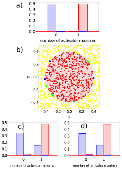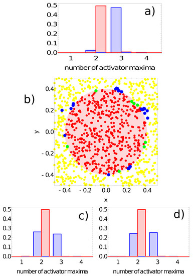 Similar results, but for the network defined by the parameters listed in the second line of Table 1, are shown in Figure 10. Again, node #1 is the network output because on nodes #2 and #3, we observe one activator maximum for a large number of records representing points located both in and out of the sun area (cf. Figure 10c,d). For node #1 (Figure 10a), most records representing points inside the sun area produced a single maximum, and for most points located outside the sun, no maximum was observed (cf. Figure 6b). Therefore, node #1 is the output, and the classification rule is: