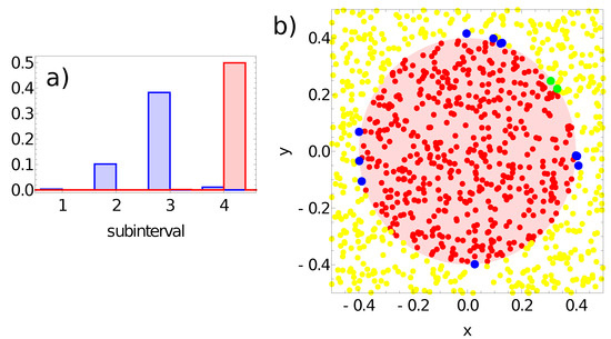 The answer of the network defined by the parameters listed in the third line of Table 1 to the records of training dataset. (a) The probability distribution of obtaining the value of in the intervals for . The red bars correspond to points inside the red area; the blue bars refer to points outside the red area. Subfigure (b) illustrates correctly (yellow and red) and incorrectly (green and blue) classified points of the training dataset.