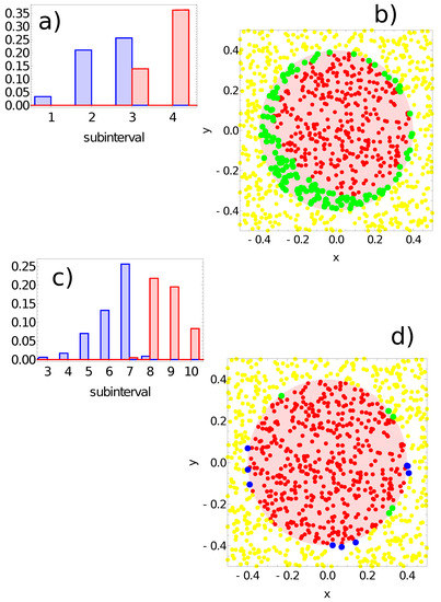 The answer of the network defined by the parameters listed in the fourth line of Table 1 to the records of training dataset. (a) The probability distribution of obtaining the value of in the intervals for . The red bars correspond to points inside the red area; the blue bars refer to points outside the red area. Subfigure (b) illustrates correctly (yellow and red) and incorrectly (green) classified points of the training dataset. As in (a,b) but for node #3: (c) the probability distribution of obtaining the value of in the intervals for . Subfigure (d) illustrates correctly (yellow and red) and incorrectly (green and blue) classified points of the training dataset.
